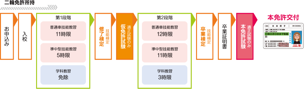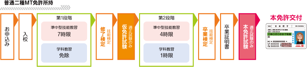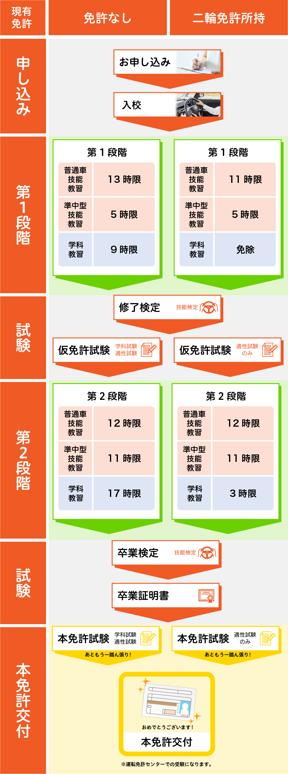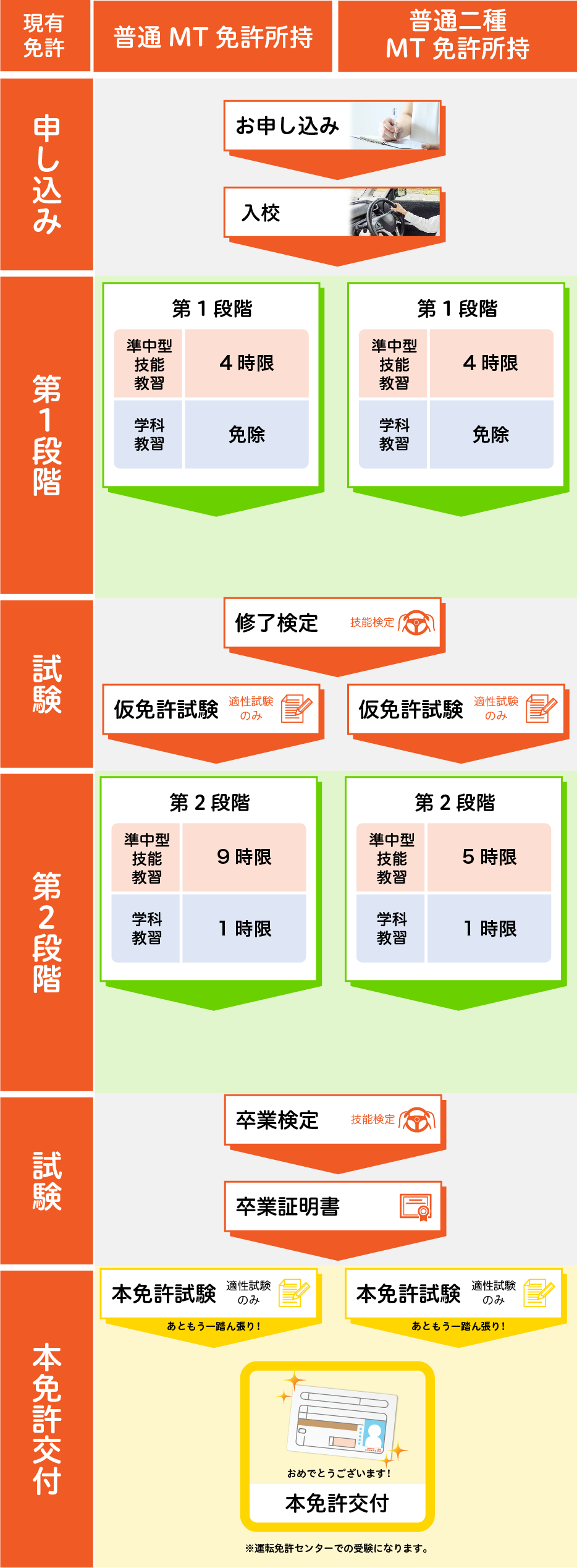 普通車技能 13時限 準中型技能 5時限 学科 9時限 | 普通車技能 11時限 準中型技能 5時限 学科 免除 | 準中型技能 4時限 学科 免除 | 準中型技能 4時限 学科 免除 |